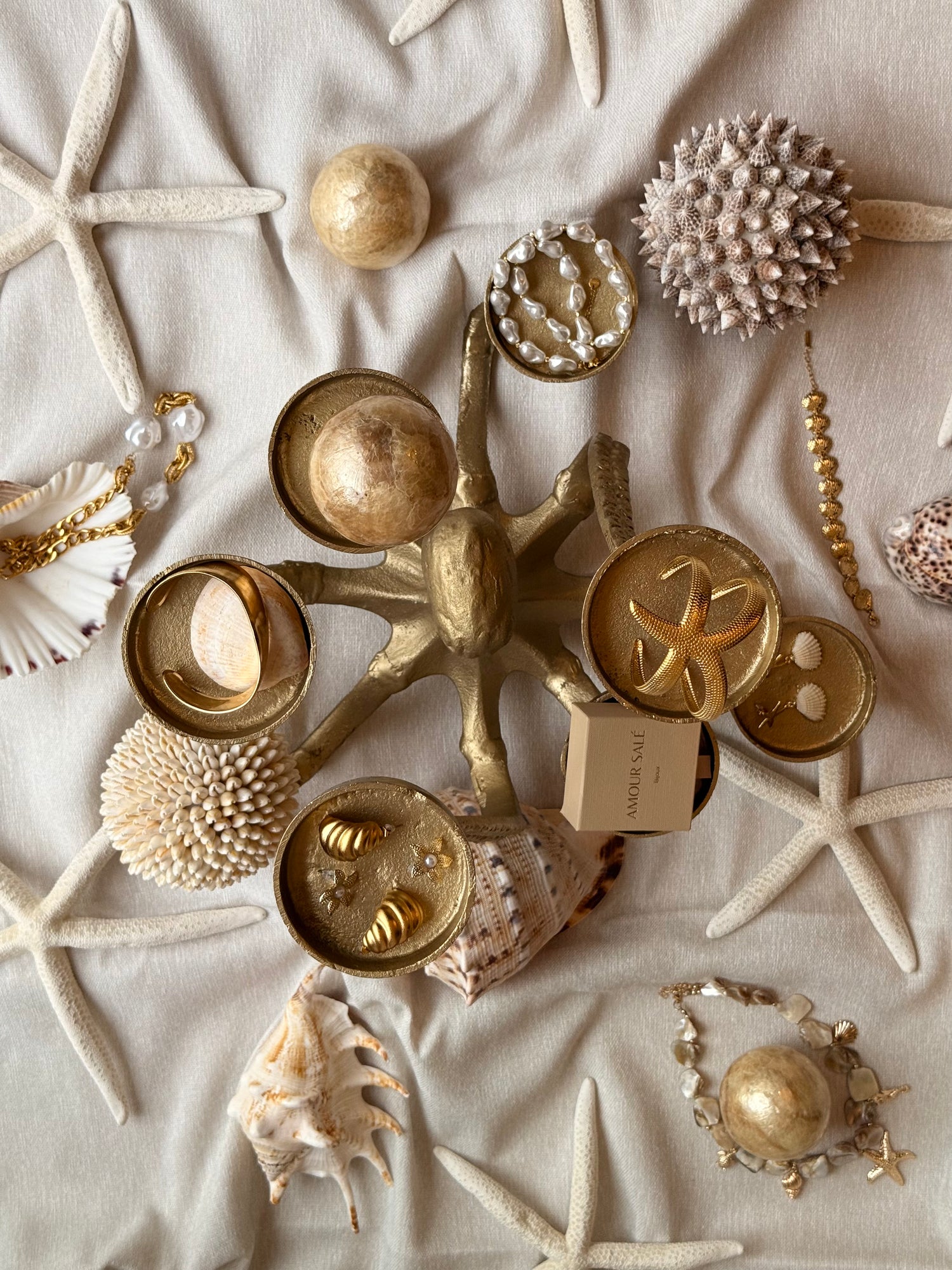Ces bijoux sont des fragments d’océan : des coquillages, des perles, de la lumière capturée dans du métal qui ne craint ni l’eau, ni le temps.