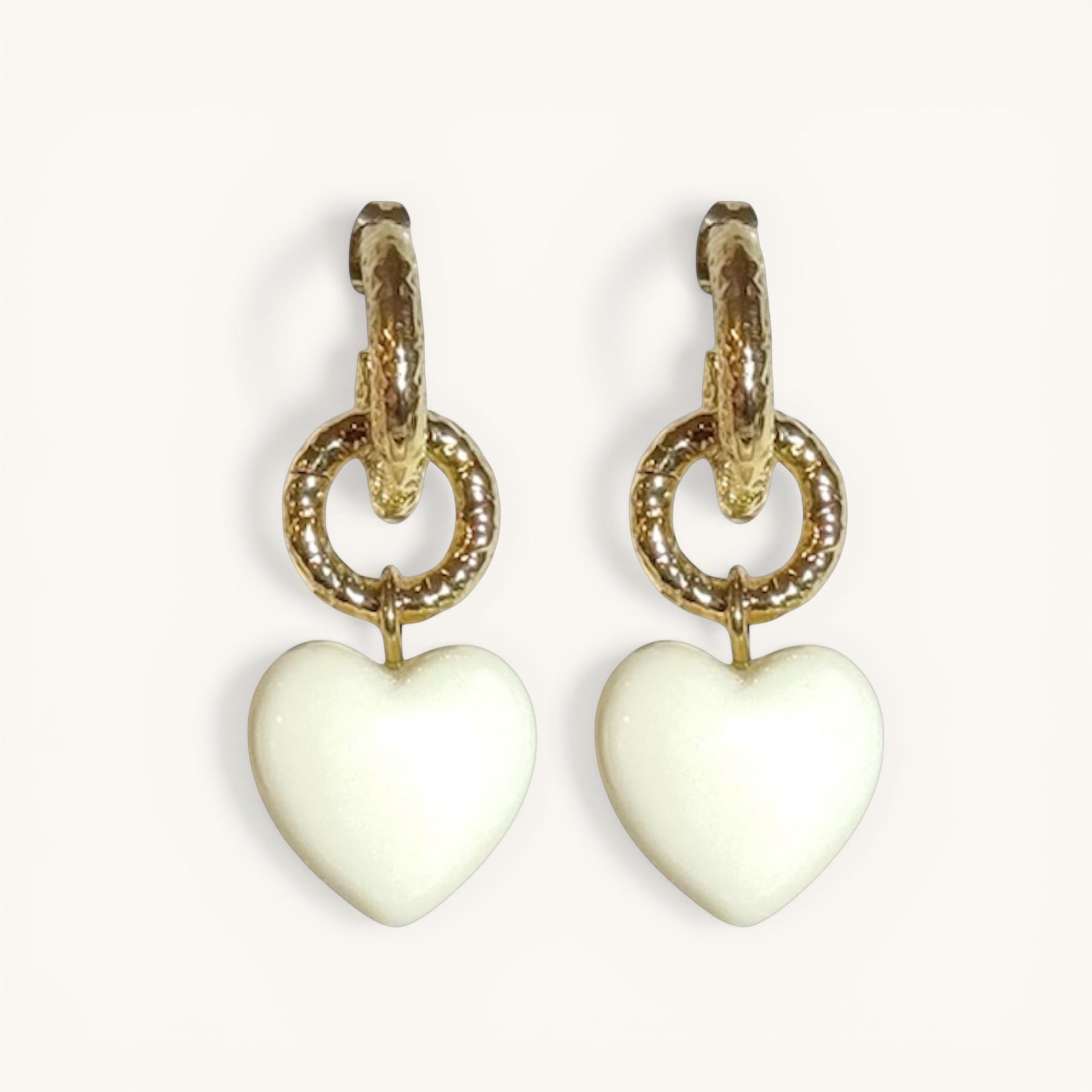 Élégantes et délicates, les boucles Alma associent la modernité de demi maillons entrelacés à la douceur d’un cœur effet céramique blanc cassé, suspendu avec légèreté. Le contraste entre les lignes graphiques de la maille et la rondeur du cœur crée un bijou à la fois contemporain et profondément féminin.