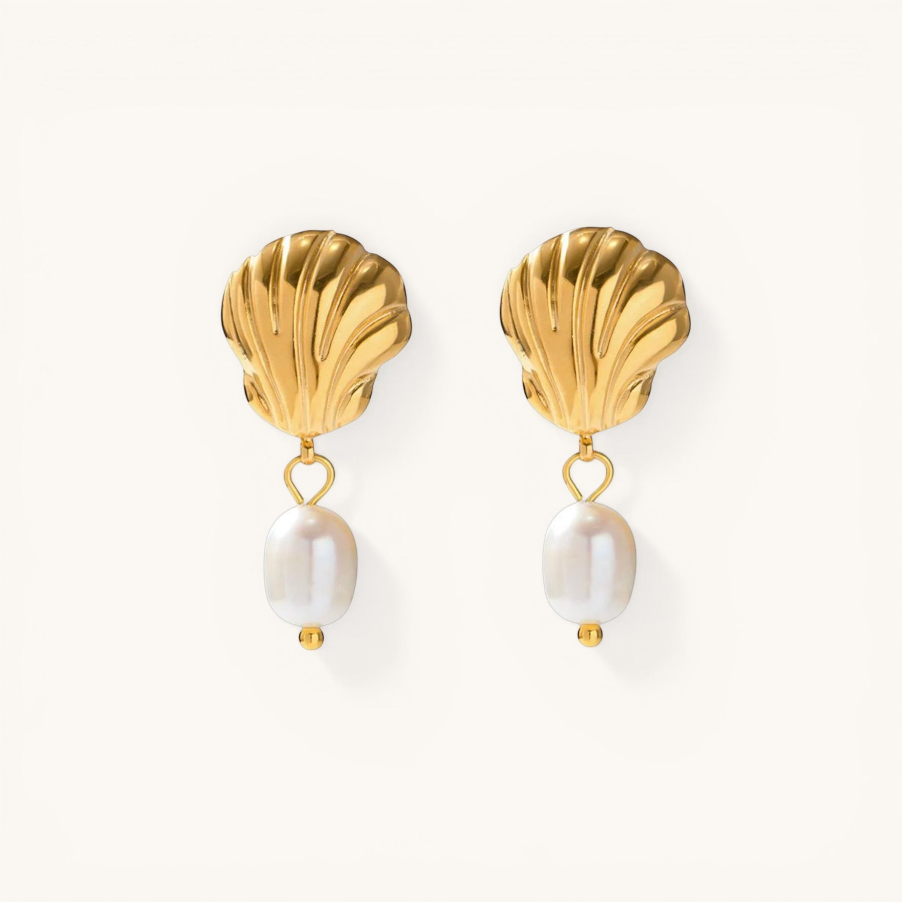Boucles d'oreilles Marina avec coquillage doré et perle nacrée. Waterproof et durables. Bijou lumineux inspiré de la mer, élégance marine intemporelle.